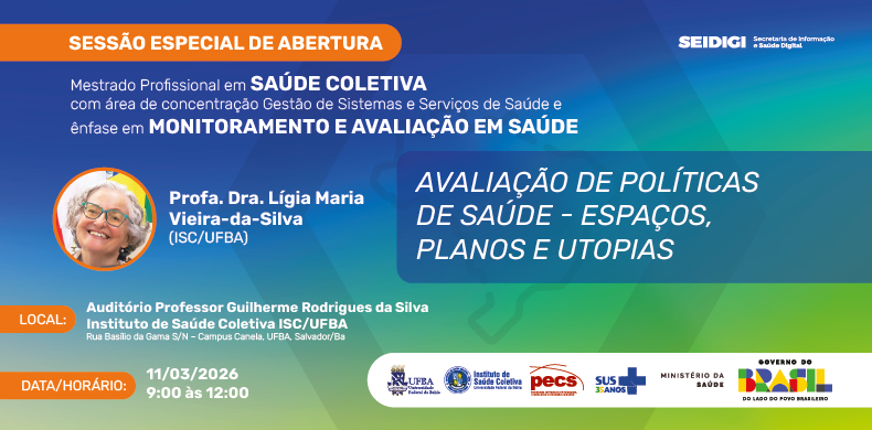 O Instituto de Saúde Coletiva da Universidade Federal da Bahia (ISC/UFBA) e o Departamento de Monitoramento, Avaliação e Disseminação de Dados e Informações Estratégicas em Saúde (DEMAS) da Secretaria de Informação e Saúde Digital do Ministério da Saúde (SEIDIGI/MS), têm a satisfação de convidar para a Sessão de Abertura do Curso de Mestrado Profissional em Saúde Coletiva com área de concentração Gestão de Sistemas e Serviços de Saúde e ênfase em Monitoramento e Avaliação em Saúde, a ser realizada no dia 11 de março de 2026 (quarta-feira) a partir das 09:00 horas, em Salvador- BA, no auditório do ISC/UFBA.