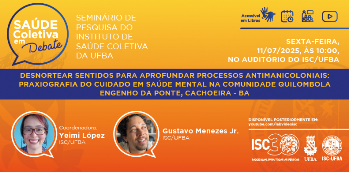 Nesta sexta-feira (11), às 10 horas, o Saúde Coletiva em Debate traz uma importante discussão sobre o cuidado em saúde mental em territórios quilombolas, com apresentação do professor Gustavo Menezes (ISC/UFBA) e coordenação da professora Yeimi López (ISC/UFBA).