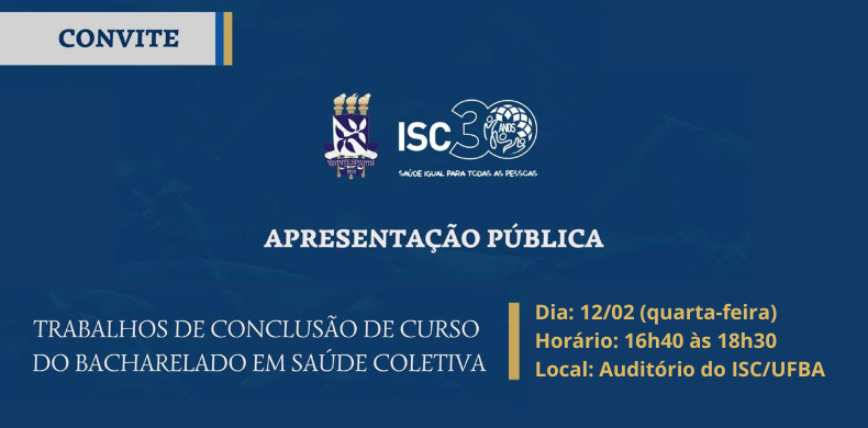 Nesta quarta-feira, 12 de fevereiro, o Instituto de Saúde Coletiva da Universidade Federal da Bahia (ISC/UFBA) realiza a apresentação pública dos Trabalhos de Conclusão de Curso (TCCs) da turma 2024.2 do Bacharelado em Saúde Coletiva. O evento acontecerá a partir das 16h40, no auditório do ISC, no campus do Canela.