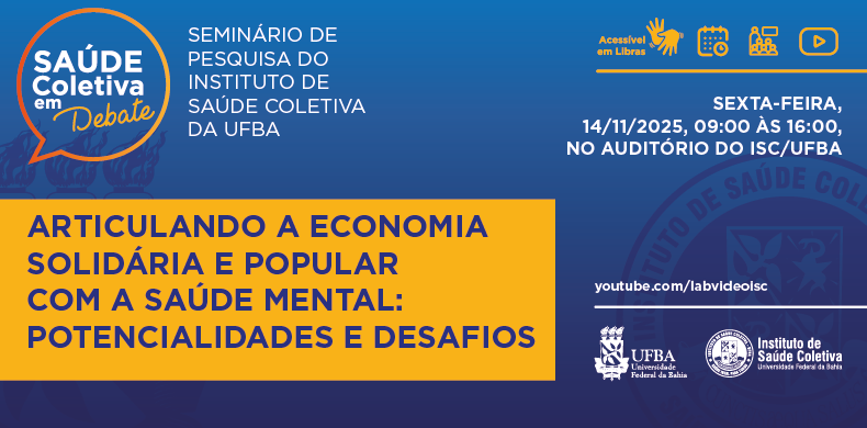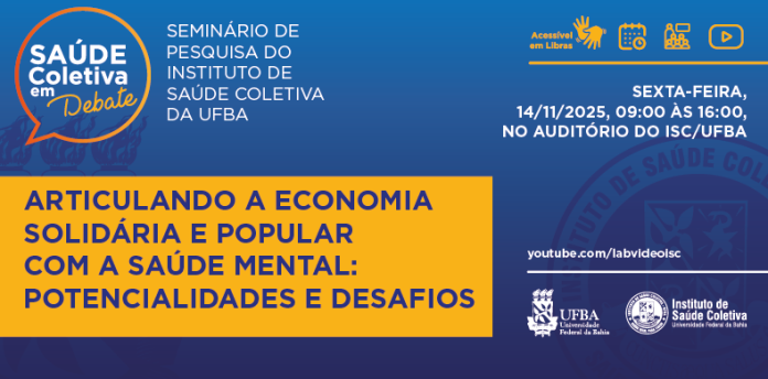 O Instituto de Saúde Coletiva da Universidade Federal da Bahia (ISC/UFBA) realiza, na próxima sexta-feira (14/11), mais uma edição do Saúde Coletiva em Debate, com o tema “Articulando a economia solidária e popular com a saúde mental: potencialidades e desafios”. O evento acontece das 9h às 16h, no auditório do ISC/UFBA, e contará com transmissão ao vivo pelo canal youtube.com/labvideoisc.
