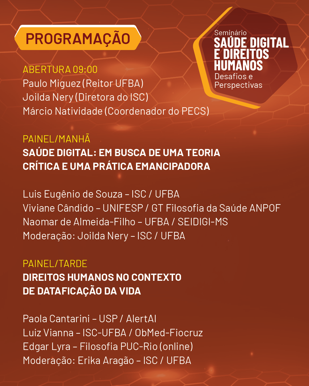 Como garantir que o avanço das tecnologias em saúde caminhe lado a lado com a defesa dos direitos humanos? Essa é uma das perguntas centrais do Seminário “Saúde Digital e Direitos Humanos: Desafios e Perspectivas”, que acontece no dia 18 de novembro (terça-feira), das 9h às 17h, no auditório do Instituto de Saúde Coletiva (ISC/UFBA), no campus do Canela, em Salvador.