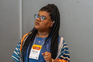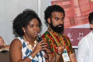 “estamos em um momento muito delicado no que se refere à pasta da saúde quilombola […]. É muito oportuno estarmos aqui, nesse espaço do ABRASCÃO. As mulheres quilombolas da CONAQ nos fortaleceram dizendo: ‘não, tem que fazer, tem que ocupar o espaço’, para que as pessoas saibam o que está acontecendo – o que Sandra e Mateus colocaram muito bem sobre os entraves na Política de Saúde Integral da População Quilombola”.