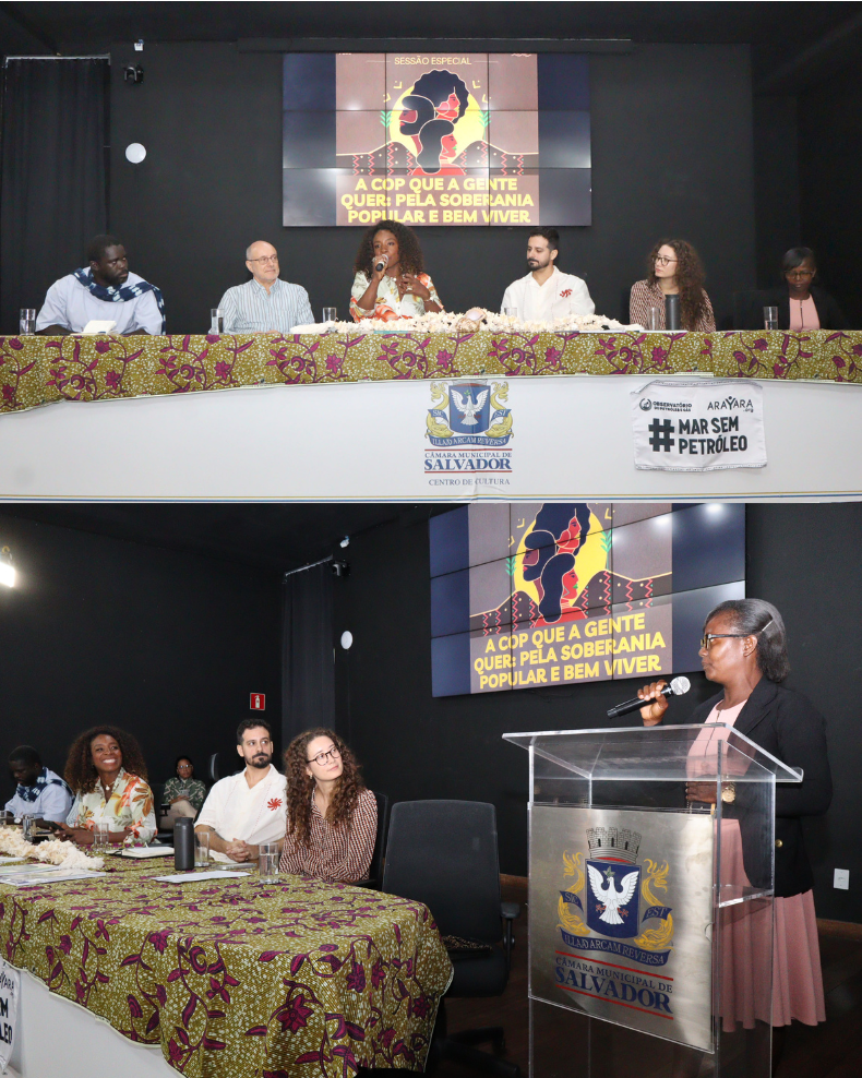 Convocada pelo Mandato Popular das Águas, da vereadora Eliete Paraguassu (PSOL), a sessão especial contou com a participação do professor Luis Eugenio de Souza, diretor do ISC/UFBA; Paulo Zangalli, professor do Departamento de Geografia da UFBA; Miguel Barros, sociólogo e especialista em planejamento e sustentabilidade da ONG guineense Tiniguena; Renata Prata, advogada e coordenadora de advocacy e projetos da Arayara; e Maridalva dos Santos, quilombola e pescadora da Ilha de Maré. O espaço também foi aberto à participação da plenária, que contribuiu para ampliar e aprofundar o debate.