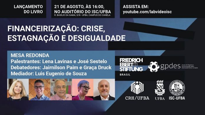 Nesta quarta-feira, 21 de agosto, o Instituto de Saúde Coletiva da UFBA promoveu o lançamento do livro “Financeirização: crise, estagnação e desigualdade”. O evento contou com a participação dos autores Lena Lavinas e José Sestelo, e dos debatedores Jairnilson Paim e Graça Druck, sob mediação do professor Luis Eugenio de Souza.