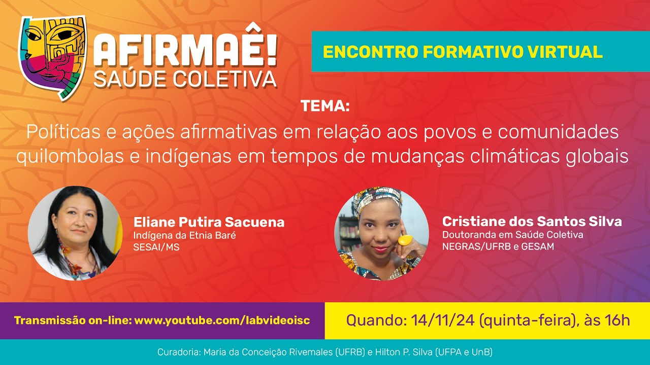 O projeto Afirmaê tá chamando geral pra colar nesse encontro massa sobre “Políticas e ações afirmativas em relação aos povos e comunidades quilombolas e indígenas em tempos de mudanças climáticas globais”.